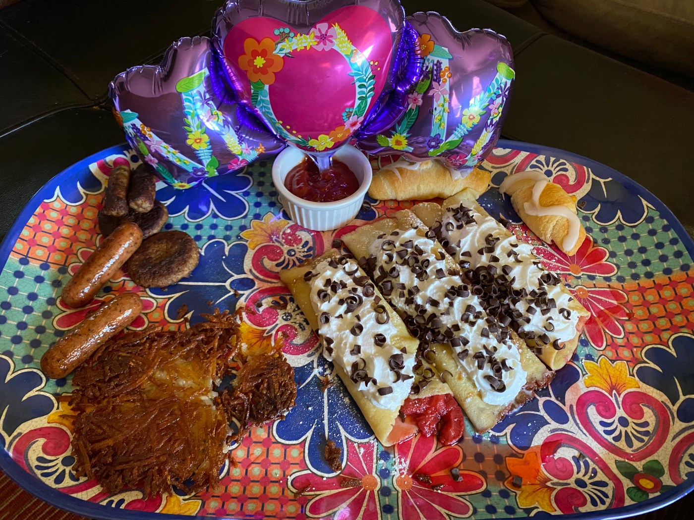 It is tradition for my family to make my Mom chocolate and strawberry crepes! I have been doing this since I was a kid, but as we grow older, things start to change. Because of working and being far from home last year I missed out on celebrating with her, so I wanted to make sure we made up for last year, so we (my dad and I) woke up early to get cooking! We made a complete brunch this year with her favorite crepes, hash browns, cherry filled rolls and a variety of breakfast sausages. I also got my mom a heartfelt card where I wrote a personal message on how much she truly meant to me with a new Orchid plant that I try to get her every year!